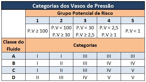 A periodicidade da inspeção nos compressores, vasos de pressão e tubulações varia de acordo com sua categoria (conforme tabela abaixo), no entanto é recomendado que seja feito no mínimo uma inspeção visual juntamente com o laudo de NR-13 anualmente.